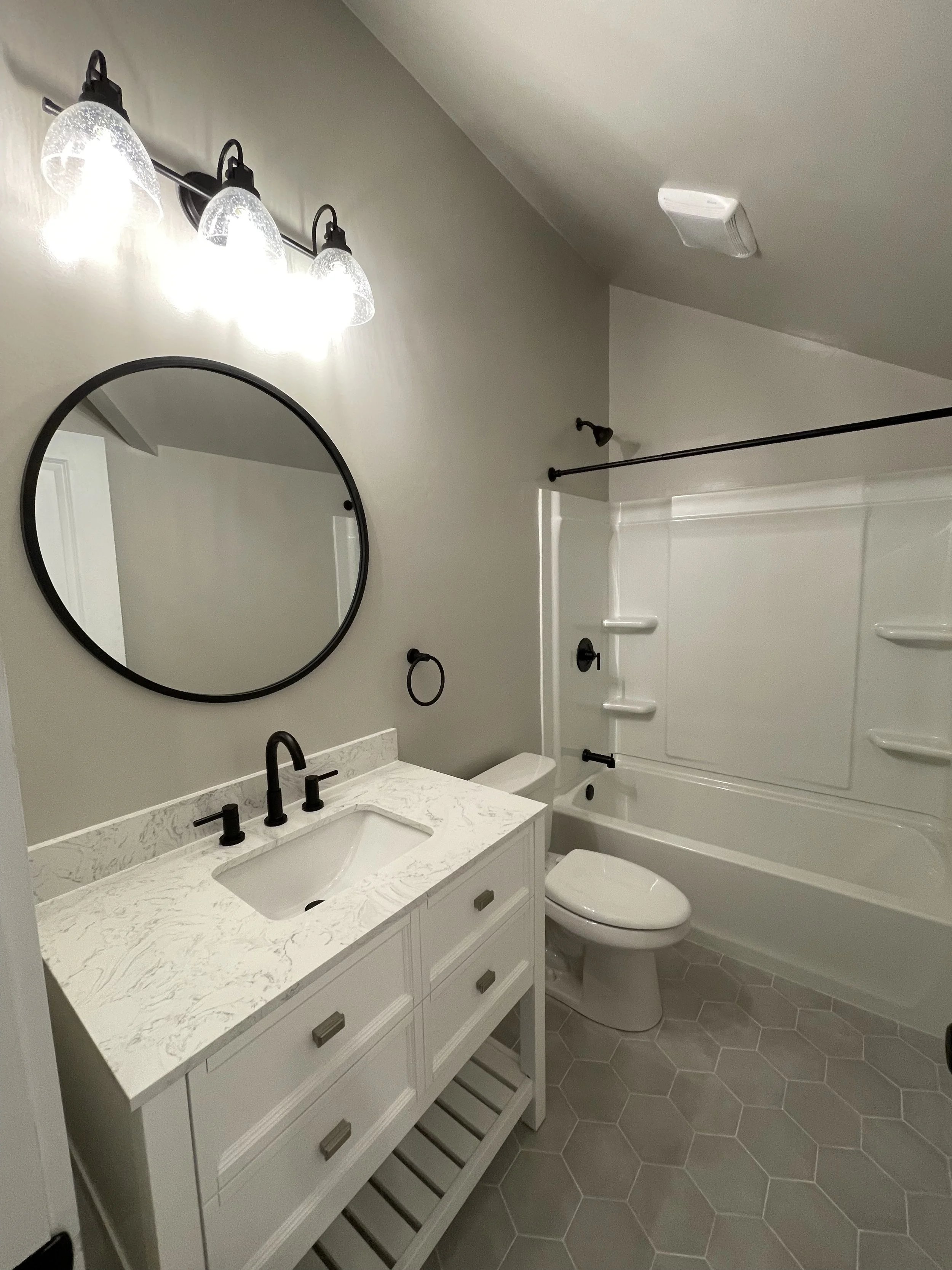 Porcelain tile bathrooms with quartz vanities